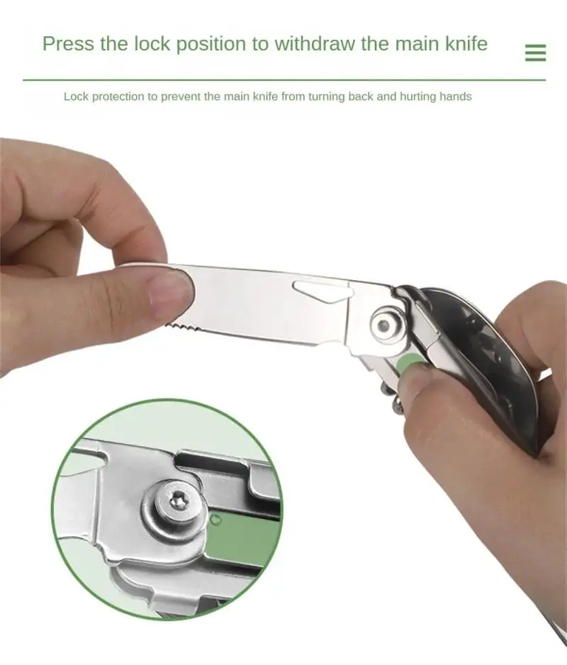 5. Press the lock position to retract the main knife, lock the protection, avoid the main knife back to hurt the hand, easy to use.