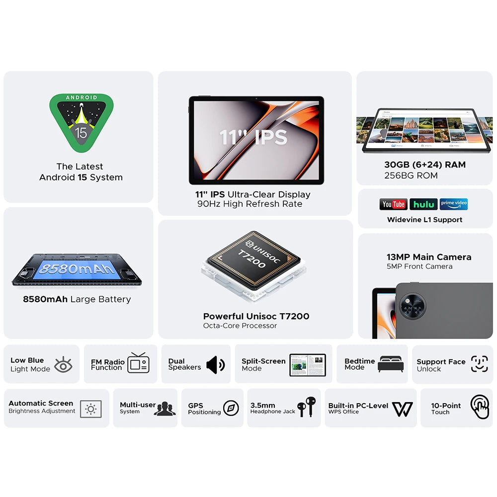 Global Version DOOGEE U11 Pro Android 15 Tablet 30GB(6+24) 256GB 11" HD 90Hz Display 8580mAh Battery Unisoc T7200 Widevine L1