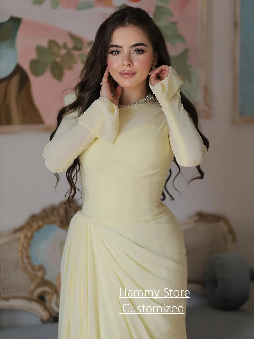 Modest Islamic Evening Dresses for Woman Customized Long Sleeves Beading Round Neck Pleat Prom Gown فساتين سهرات