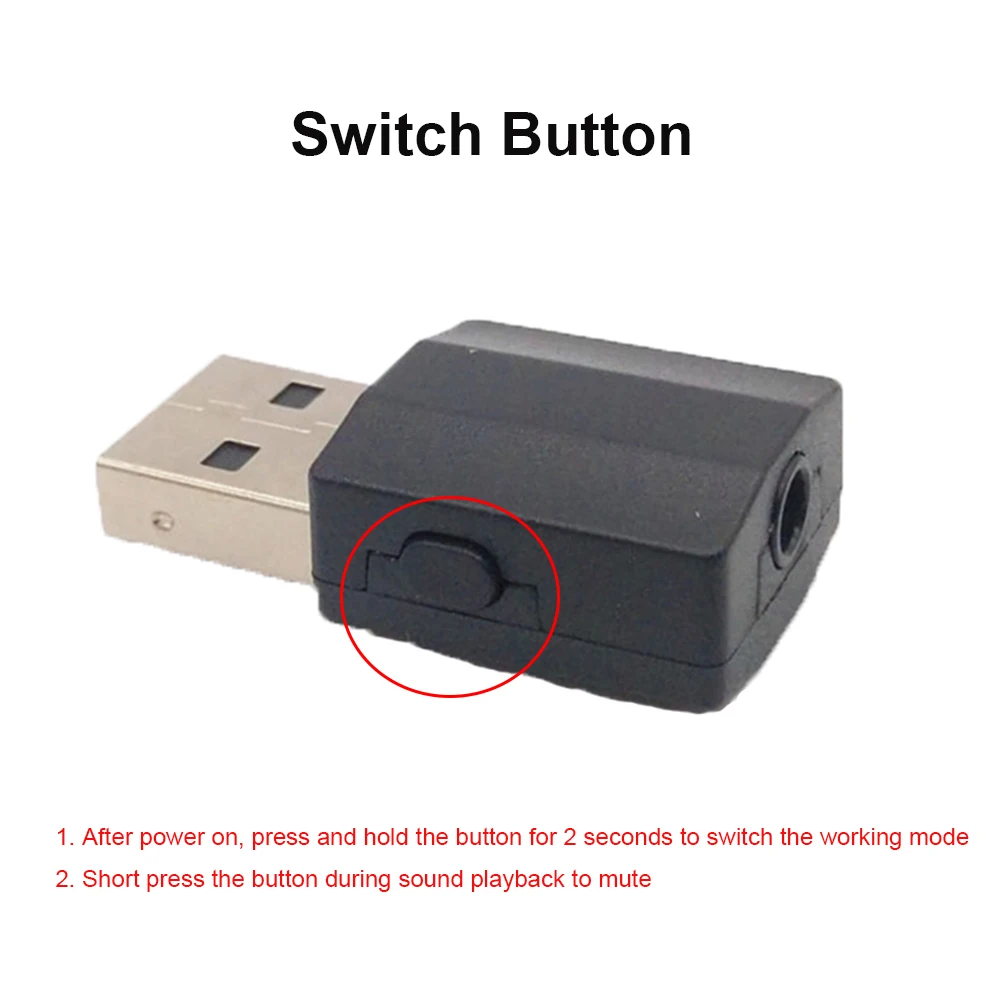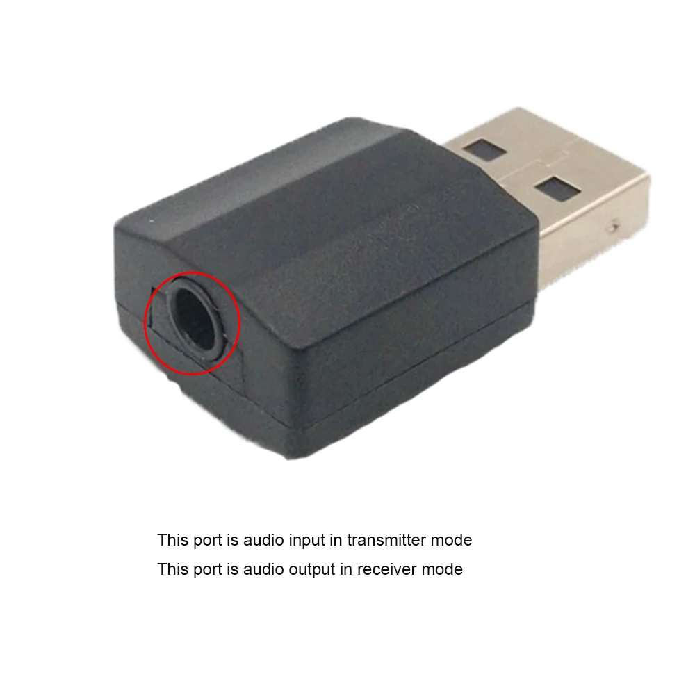 A)Receive mode usage methods: Blue LED flashes to indicate that it has switched to receive mode. The USB of this product is used for power supply and can be plugged into any USB interface with 5V output. For example, a mobile phone charger. Find the pairing name of the BT600 in the Bluetooth-Compatible settings of your phone. The paired successful Bluetooth-Compatible light will be on. Play audio files in your phone, use the 3.5 headphone cable to connect to speakers, car audio and other Bluetooth-Compatible-free devices. You can also plug in the 3.5 headphone port with a wired headset to listen to music.